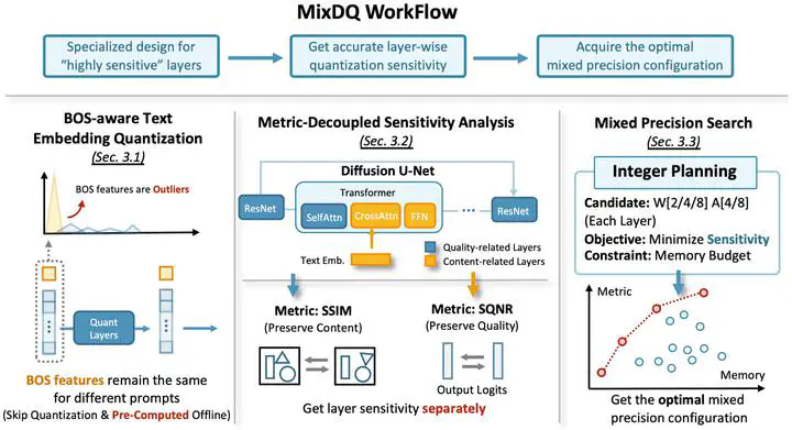 Image credit: UnsplashDiffusion models have achieved significant visual generation quality. However, their significant computational and memory costs pose challenge for their application on resource-constrained mobile devices or even desktop GPUs. Recent few-step diffusion models reduces the inference time by reducing the denoising steps. However, their memory consumptions are still excessive. The Post Training Quantization (PTQ) replaces high bit-width FP representation with low-bit integer values (INT4/8) , which is an effective and efficient technique to reduce the memory cost. However, when applying to few-step diffusion models, existing quantization methods face challenges in preserving both the image quality and text alignment. To address this issue, we propose an mixed-precision quantization framework - MixDQ. Firstly, We design specialized BOS-aware quantization method for highly sensitive text embedding quantization. Then, we conduct metric-decoupled sensitivity analysis to measure the sensitivity of each layer. Finally, we develop an integer-programming-based method to conduct bit-width allocation. While existing quantization methods fall short at W8A8, MixDQ could achieve W8A8 without performance loss, and W4A8 with negligible visual degradation. Compared with FP16, we achieve 3-4x reduction in model size and memory cost, and 1.45x latency speedup. Project Page https://a-suozhang.xyz/mixdq.github.io/